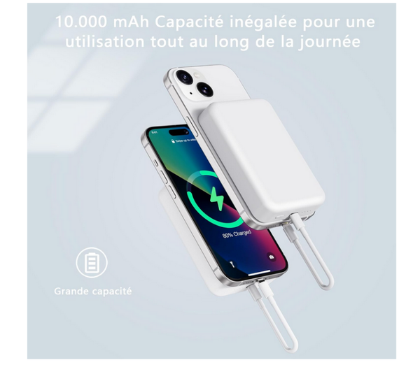 - Capacité de 10000mAh : Avec une capacité élevée de 10000mAh, cette batterie externe magnétique permet de recharger plusieurs fois vos appareils, un choix parfait pour les longs voyages ou une utilisation quotidienne.